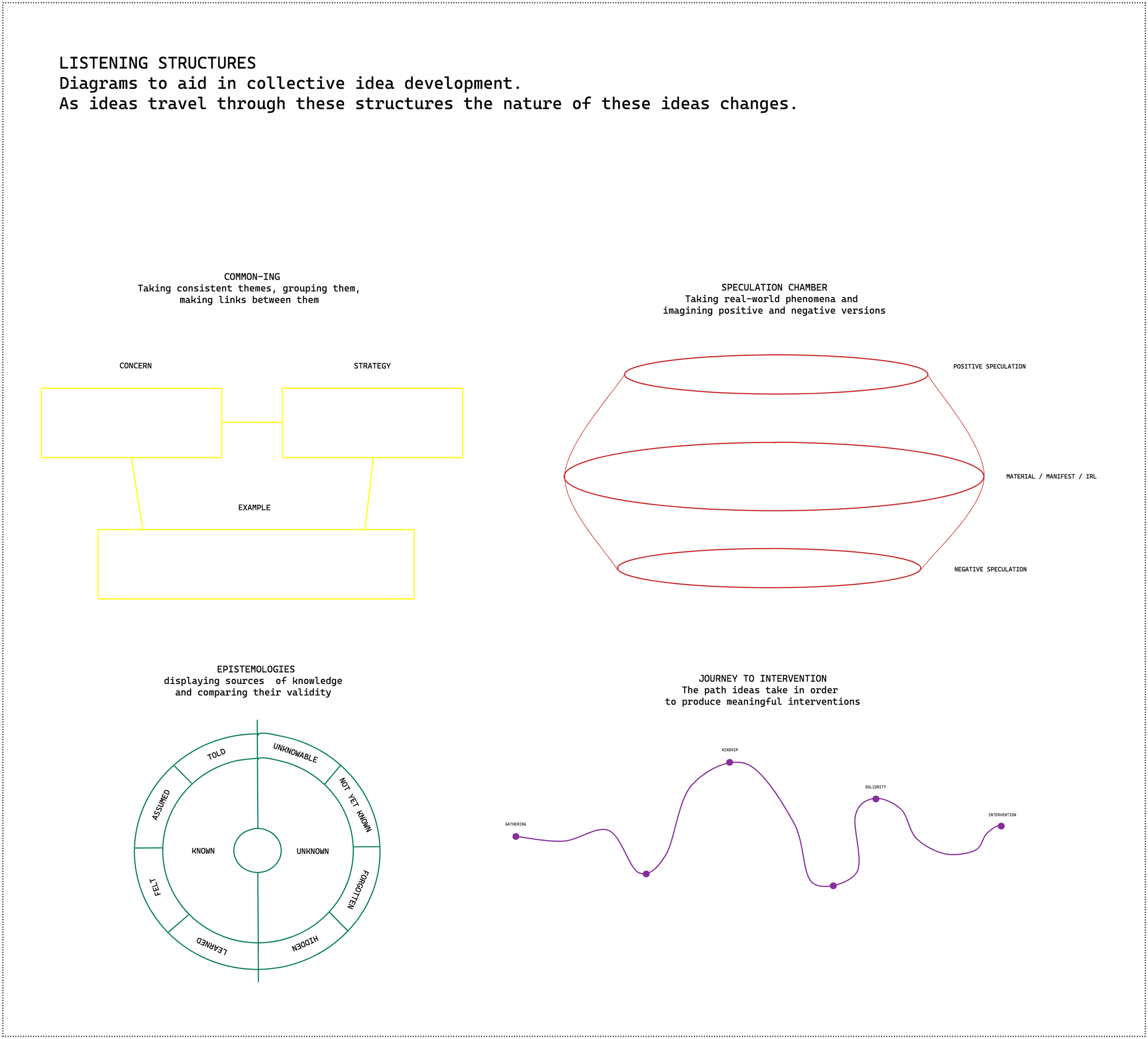 In undermining this process (a process that has become democracy in practice), new constellations of participation and outcomes are necessary. Listening Structures provide a 2-dimensional environment to capture and orient thoughts on a given technological conundrum. A series of geometric shapes that are gradually populated with words, the process asks: what would listening look like when assigned roles were no longer visible, and participants were not confined by conventional conversational dynamics (such as waiting for your turn to speak)?